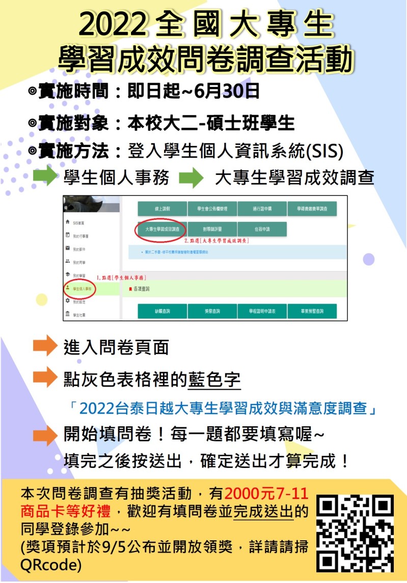 各位同學好,學校為了解同學的學習成效和滿意度,想請各位同學花一些時間協助填寫一份問卷,表達出自己的想法!而且填寫問卷後還可以參加抽獎~快來參加吧!